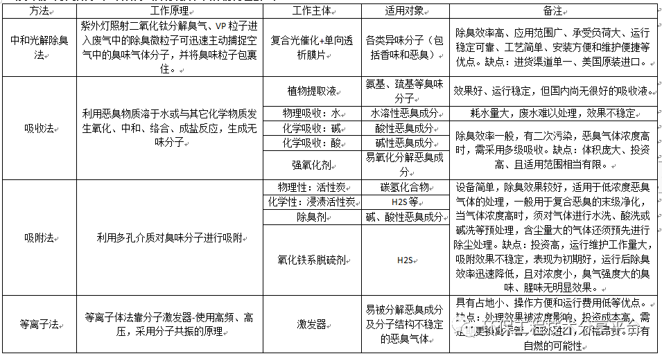 目前有机废气污染治理工艺主要有:干式中和法、吸收法、吸附法、离子除臭法、微生物降解法、臭氧法(复合活性氧法)、燃烧法及冷凝法等几种方法。各种方法各有利弊,具体情况汇总如下。