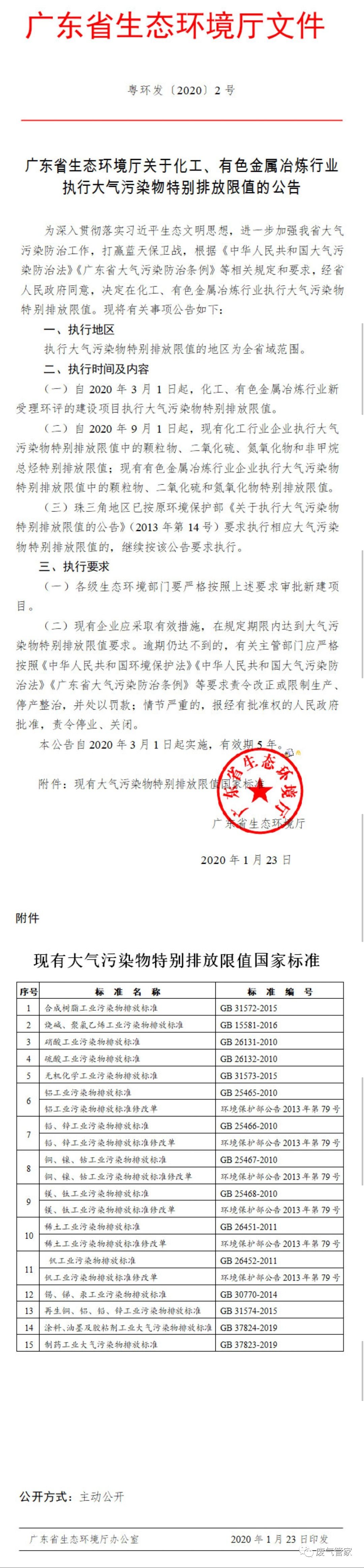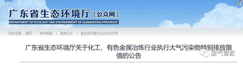 导读:日前,广东省印发《广东省生态环境厅关于化工、有色金属冶炼行业执行大气污染物特别排放限值的公告》,本公告自3月1日起实施,有效期5年。2020年3月1日起,新受理环评的建设项目统一执行;2020年9月1日起,所有化工企业执行颗粒物、二氧化硫、氮氧化物和非甲烷总烃特排限值,所有有色金属冶炼企业执行颗粒物、二氧化硫和氮氧化物特排限值。